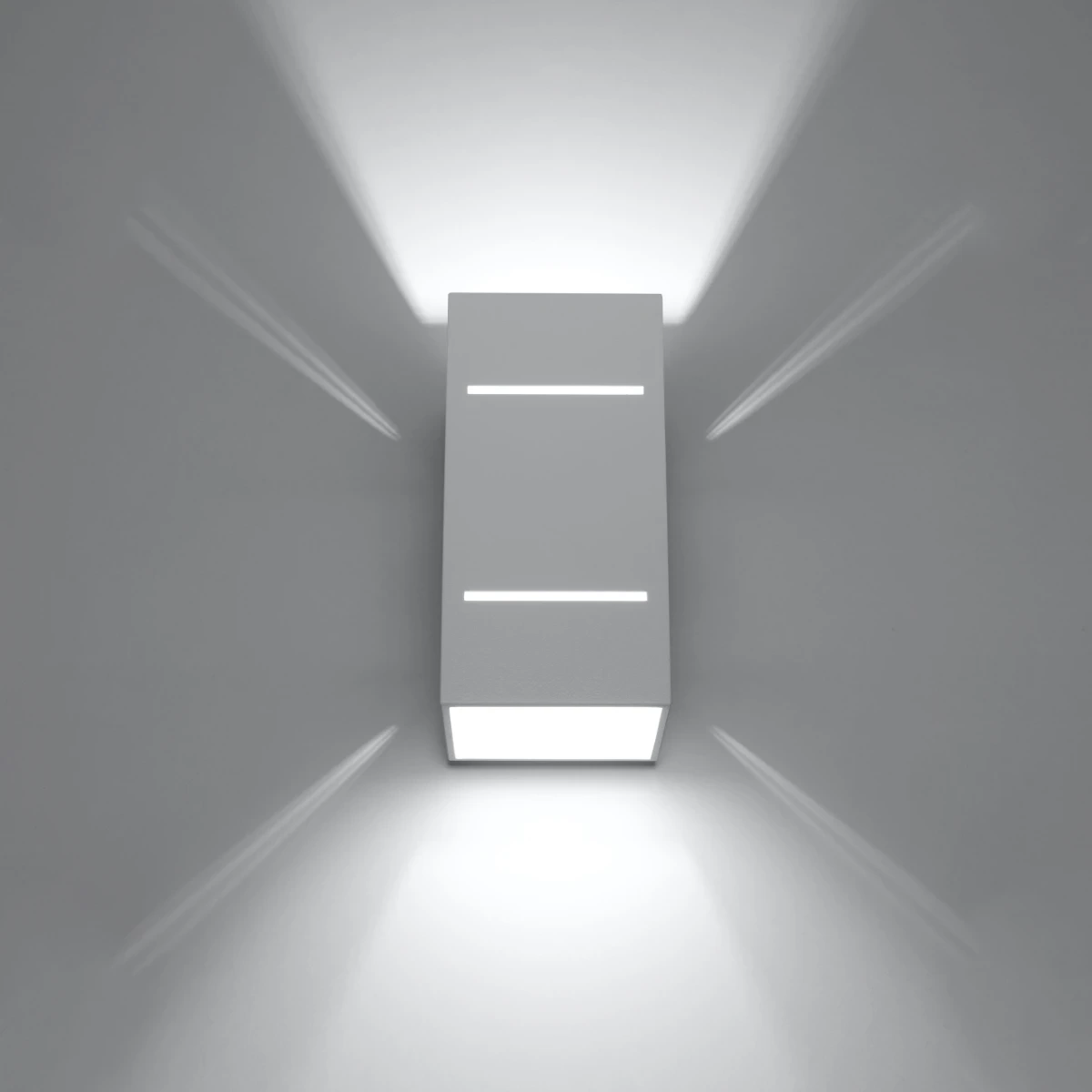 Das Licht strahlt von der BLOCCO-Wandlampe nach oben und unten aus und sickert durch die lineare Perforation in den Seitenwänden des Schirms. Wenn Sie es einschalten, verwandeln Sie die ganze Wand in eine beeindruckende Dekoration.